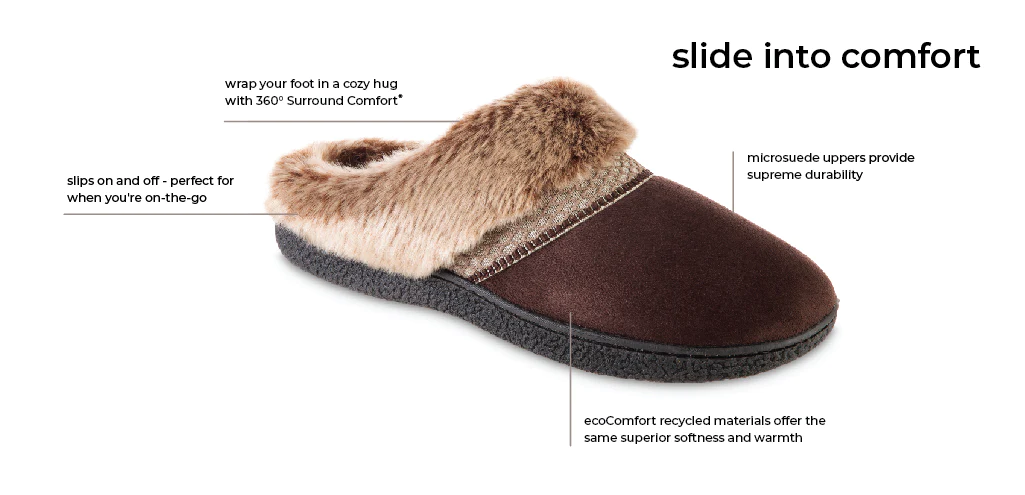 A classic clog silhouette ensures effortless slip-on convenience, while durable microsuede delivers long-lasting wear. Inside, innovative memory foam with Isotoner 360° Surround Comfort™ wraps your foot in a gentle, supportive hug for all-day ease.