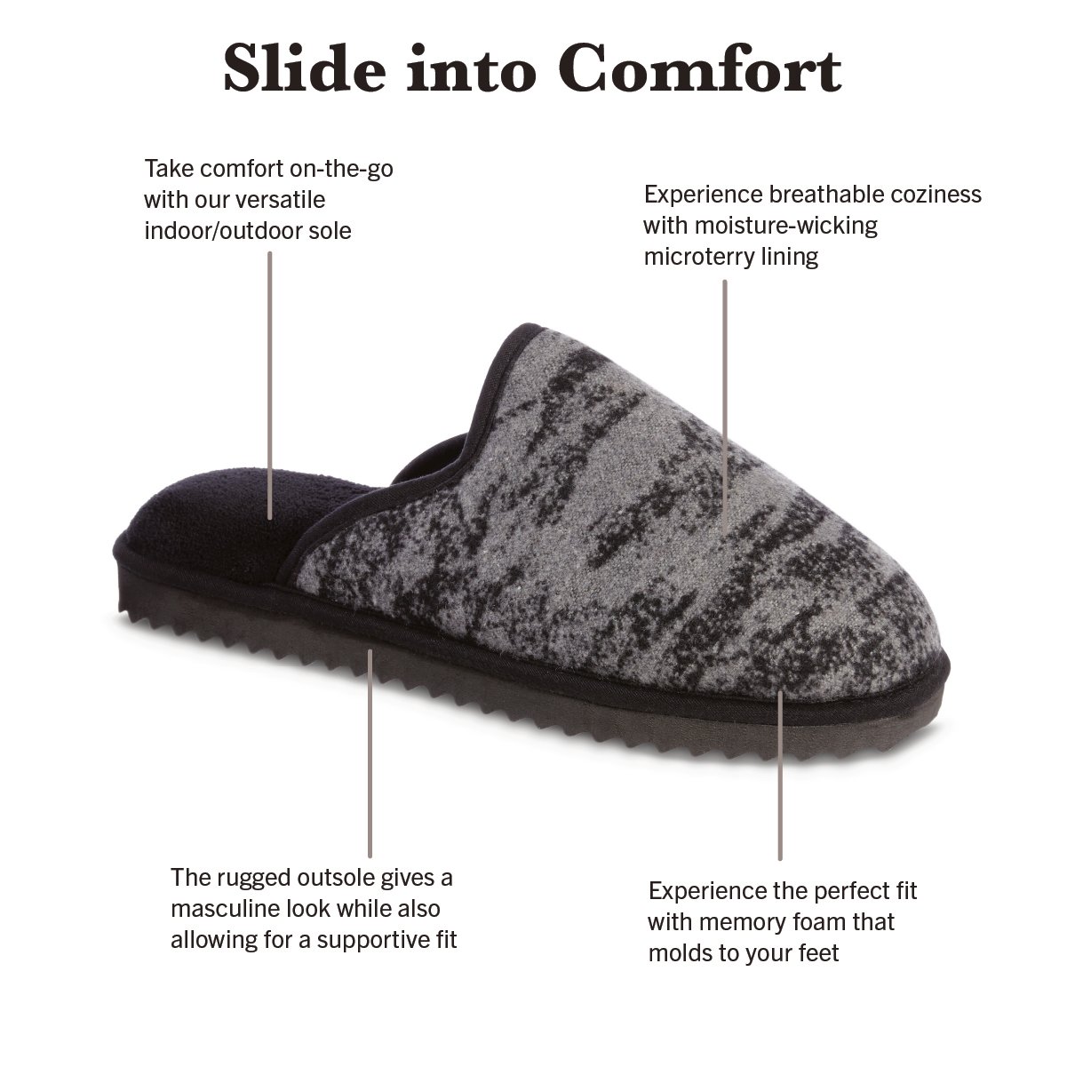 Inside, moisture-wicking microterry lining keeps feet dry and fresh, complemented by cushioned memory foam that molds to your unique shape for truly personalized comfort. This thoughtful engineering makes daily transitions seamless, whether you're relaxing at home or stepping outside.
