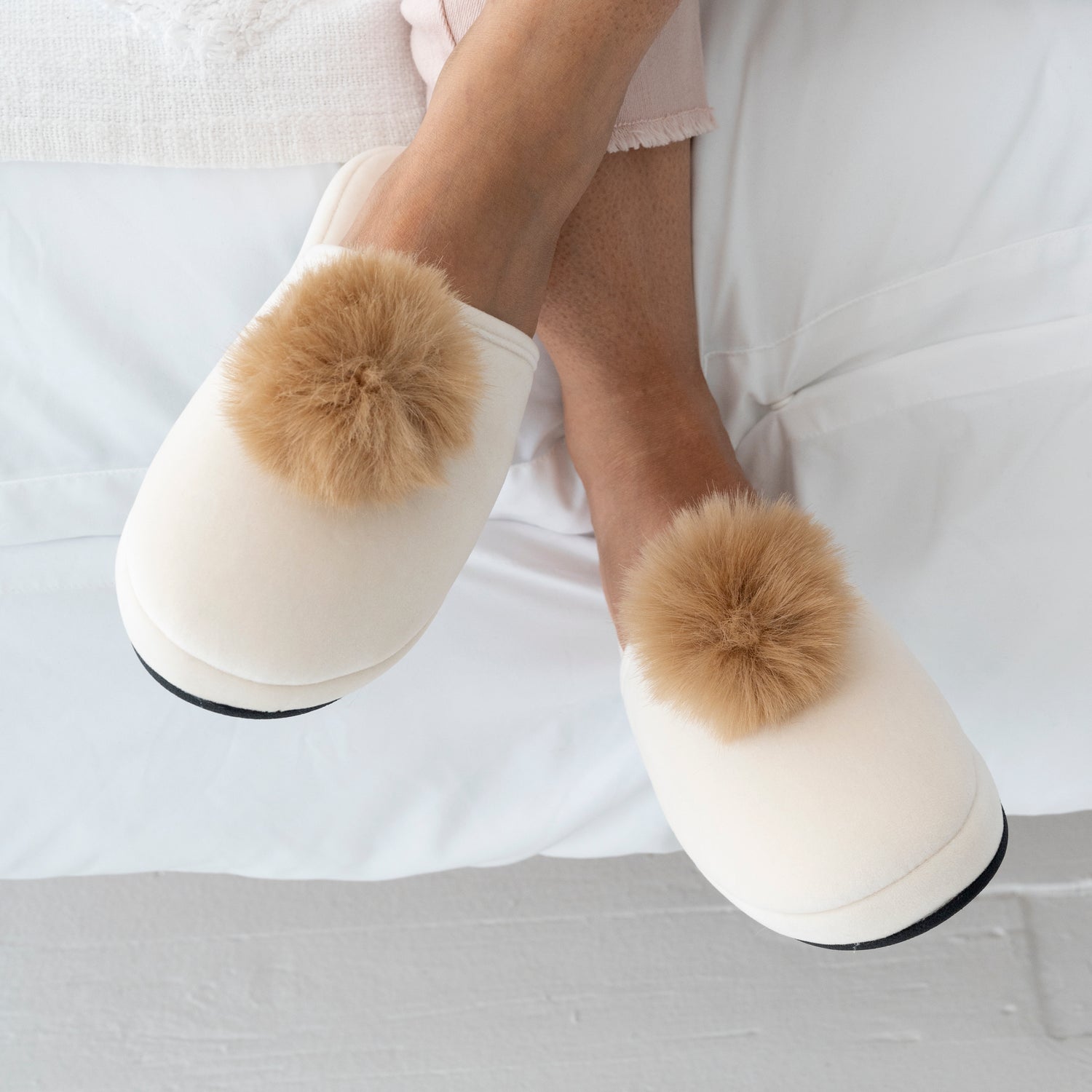 Wrapped in plush velour and crowned with a playful faux fur pom-pom, these slippers bring a sophisticated wink to lounging. A memory foam footbed molds to your unique shape, offering a truly custom fit that pampers you with every step.